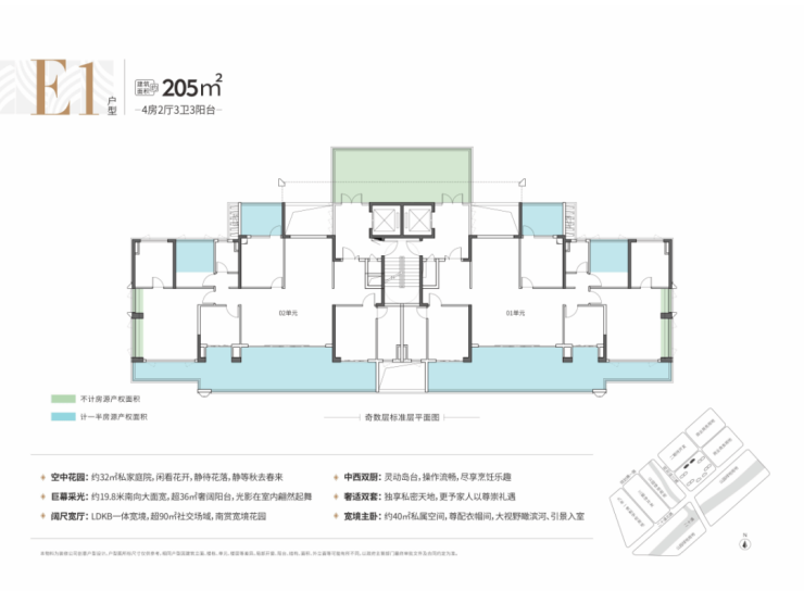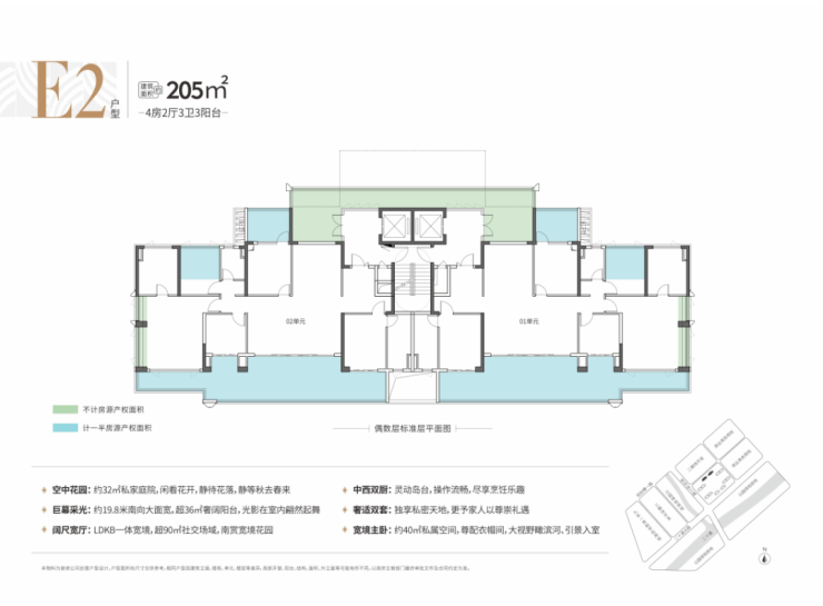 比如建面约205平4房(E2户型),不仅拥有一个约36平的阔绰阳台,还有一个约32平的专属庭院,可以在大平层实现庭院生活理想。