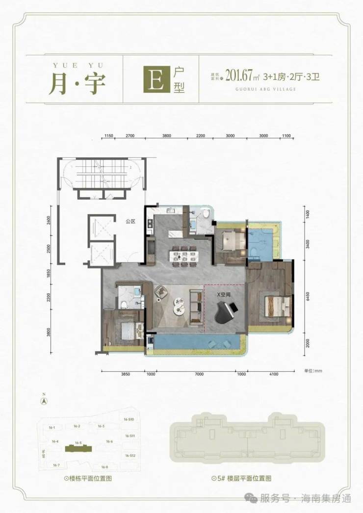 E户型: 建面约201.67㎡ 3+1房2厅3卫