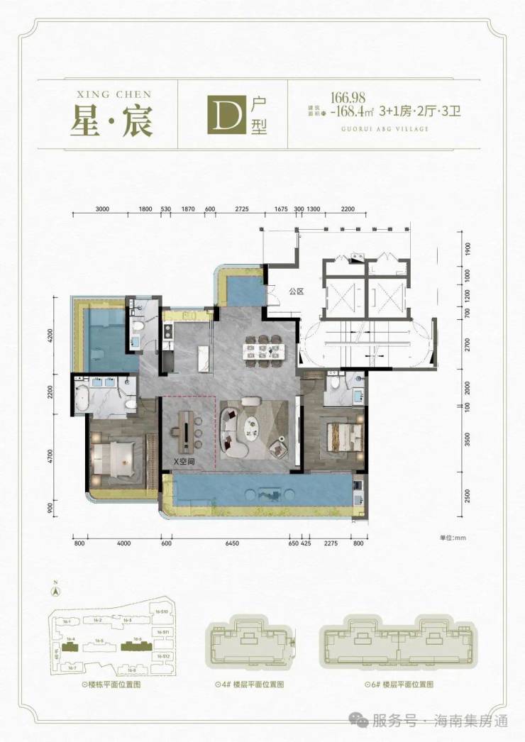 D户型: 建面约167-168㎡ 3+1房2厅3卫