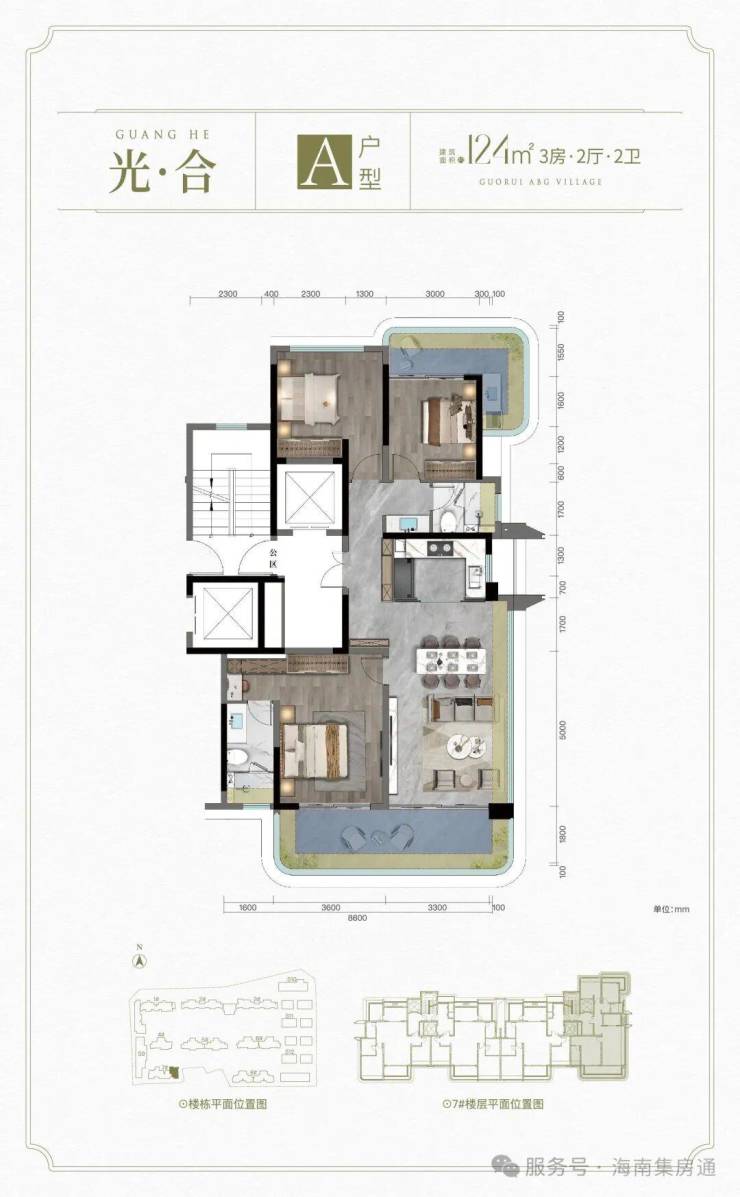 A户型: 建面约124㎡ 3房2厅2卫