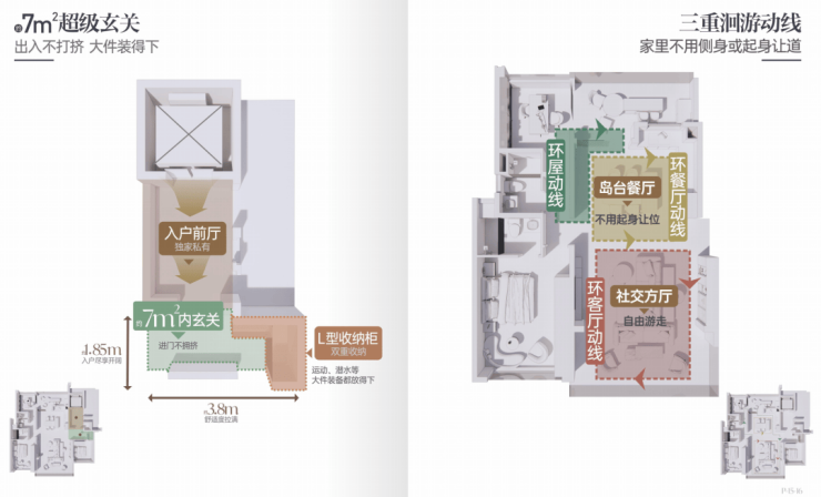 约8.48㎡私享前厅,从出电梯到入户门之间的阔气前室空间就相当于你家的私人领地,鞋柜、收纳柜、步入式玄关随你打造。