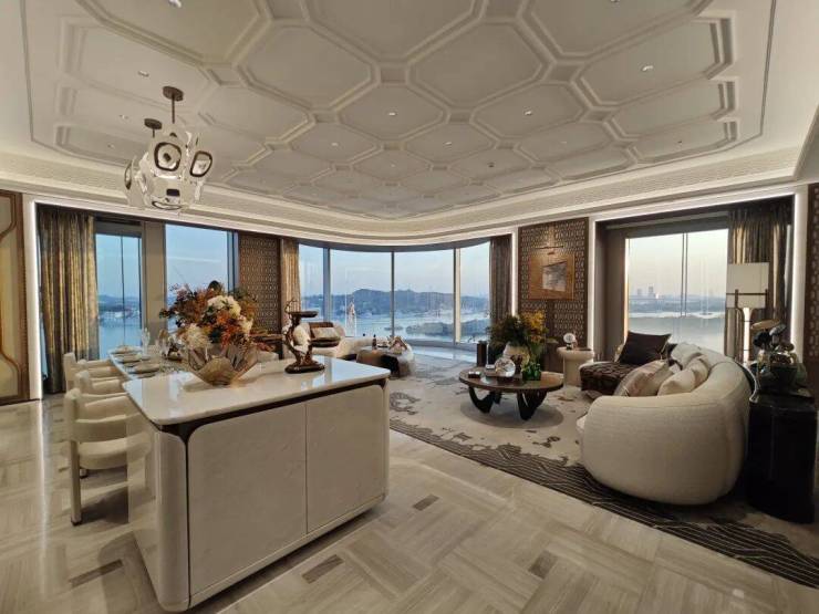 保利鱼珠岛项目把大平层公寓产品做到了极致,室内3.55-3.9米的层高超越了绝大部分豪宅的设计,大面积观景玻璃幕墙的设计更是将景观最大化,让江景与城景更好的融入到室内,坐在客厅便可一览南向珠江美景。