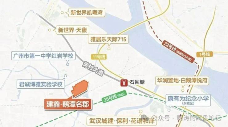 鹅潭名郡临近荔湾区政府,交通还是可以的,离11号线石围塘站的步行距离大概是800米左右,地铁11号线是广州首条市区大环线,串联广州中心五区,与广州现有及未来的所有地铁实现换乘,被称为“换乘之王”,虹吸全广州的优质资源。