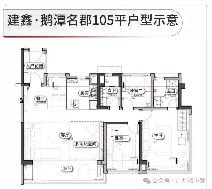 总共有3个面积,分别为88-105-125平三四房,户型图如下: