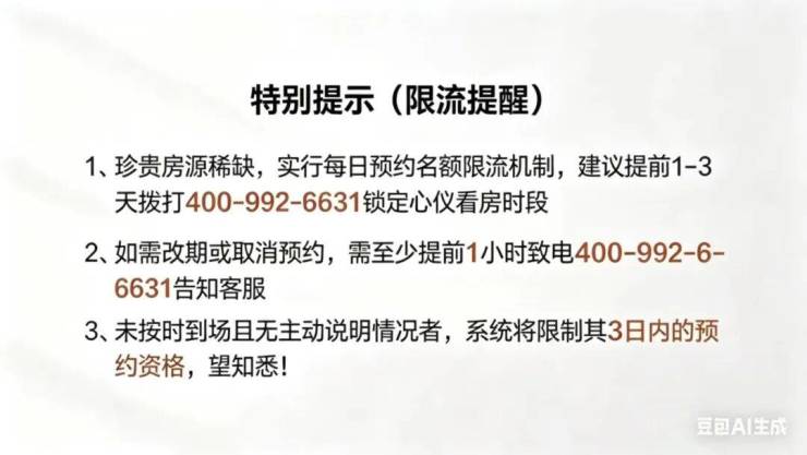 3.预约权益审核:后台客服完成客户信息核验登记后,统一下发专属预约资格凭证、专属置业顾问联系方式及线上 VR 全景看房访问权限,预约权益仅限登记本人使用,禁止转借转让。