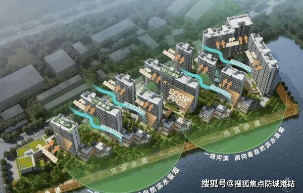 户型排布从石榴岗河自东向西依次升高,保证了约300米宽的生态水景面。
