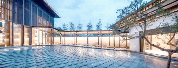 七法:精简实墙面,取代以大面积阔景透光玻璃,开窗率达到44%:精简厚重坡屋顶,采用带有金属质感的平屋面错位而置,呈现峰峦叠嶂的意境。