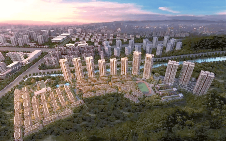 项目北面临水,南面望山,占据科学城板块稀缺的山地资源,坐享自西向东绵延1千米的一线山景,绿化率高达40%。项目的规划遵循“临水而立,循山而居”的理念,让山地肌理与建筑空间相生相长。