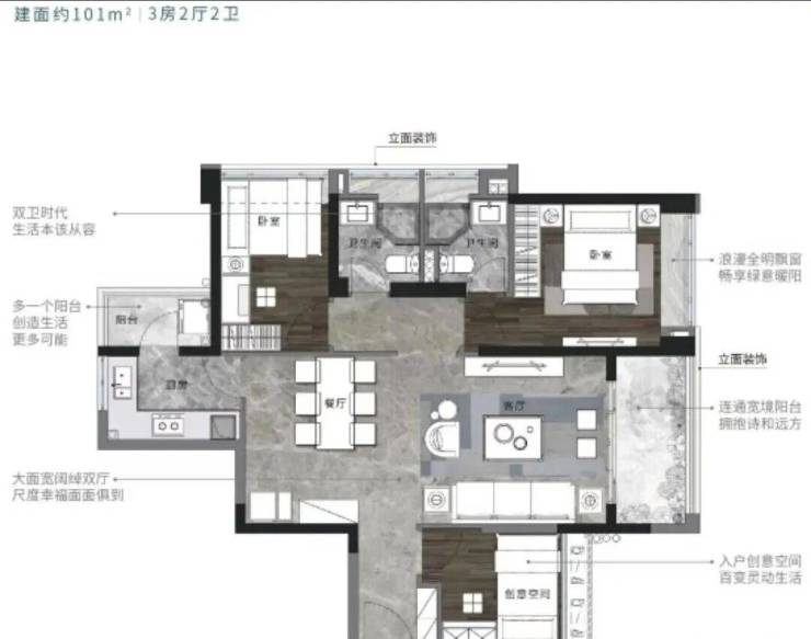 3、产品设计精细户型涵盖65-130㎡二至四房,满足不同家庭需求。部分户型采用横厅设计、干湿分离卫浴等,注重居住舒适度。外立面由真石漆、铝合金等材质打造,简洁现代。