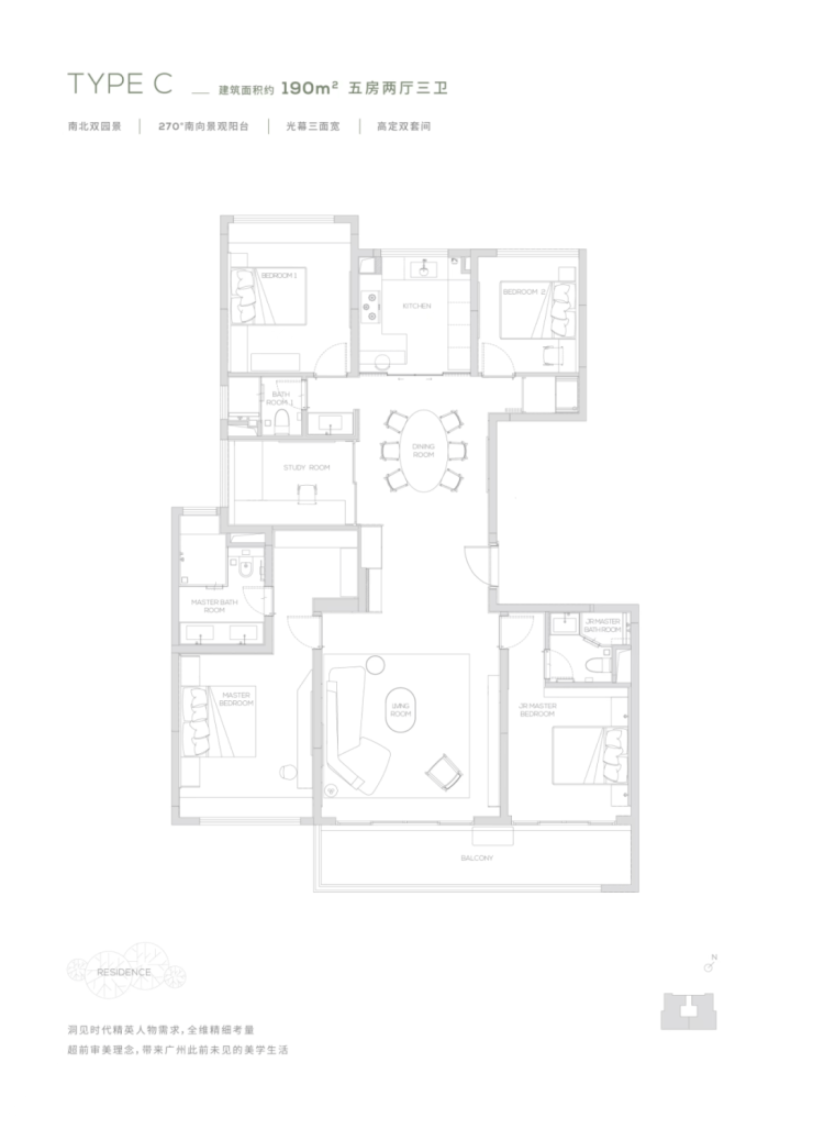 项目产品涵盖145-320㎡三至五房,目前在售户型:145㎡三居、174㎡四居、190m²五居和260m²五居,是天河市中心难得的半山大宅。