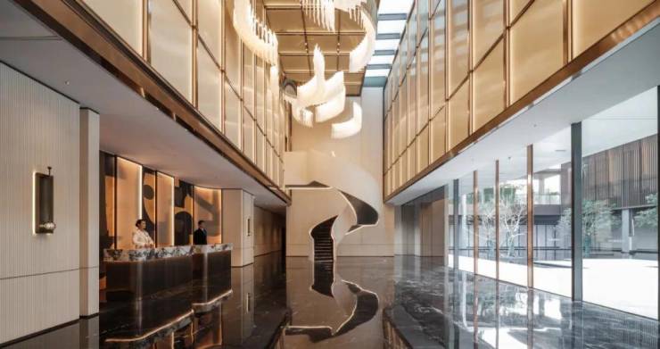 约8-10米挑高大堂,以天然的石材搭配金属线条,再配上细腻肌理的墙面、繁复的地面拼花,尽显美学艺术。