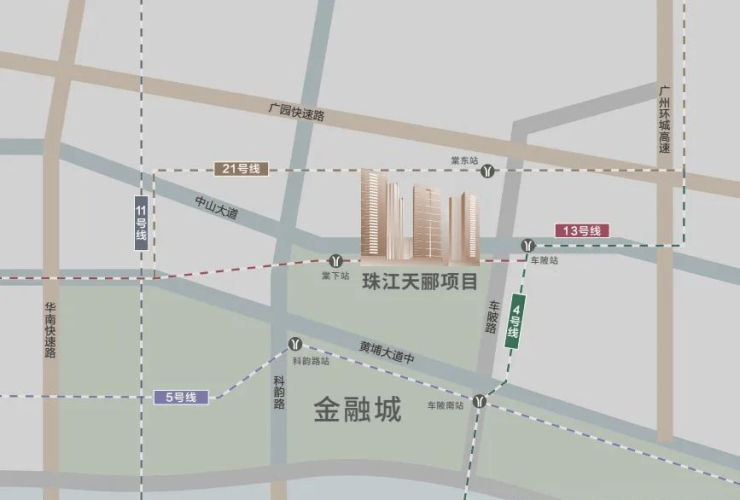 项目位于4号线车陂站西边直线约600米,楼下就是BRT,现成的地铁有4号线,5号线,21号线,还有在建的13号线二期,轨道交通发达!