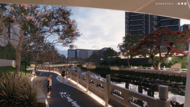 形成一个“三山一水”的自然景观格局,相当于做到内有河涌滨水园林,外有公园、山景与江景的立体生态。