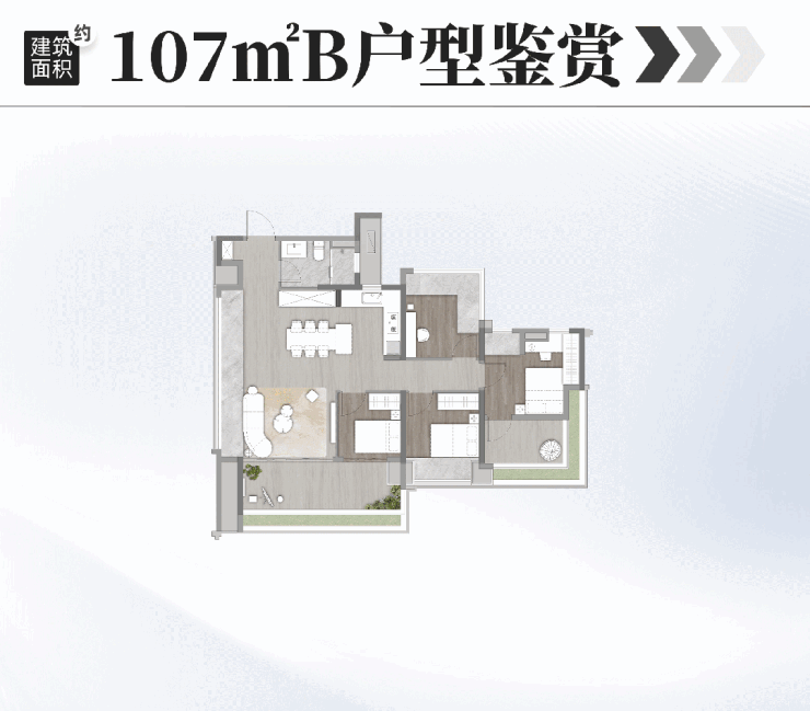 建面约107平产品根据不同改善家庭的需求,打造了两种户型。两个户型都做到南向四开间,确保不同家庭成员的居住舒适度。阳台270°环幕视野,江景、城景一览无余。屋内都预留有X空间,满足家庭进阶中的空间需求。