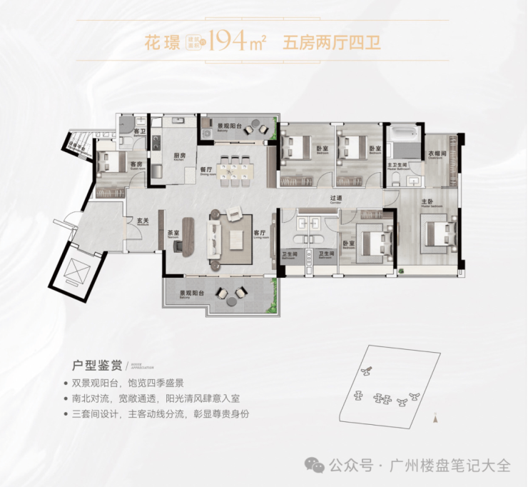 👇194㎡五房2厅4卫(南北对流),奢阔五房大平层,双景观阳台南北通透