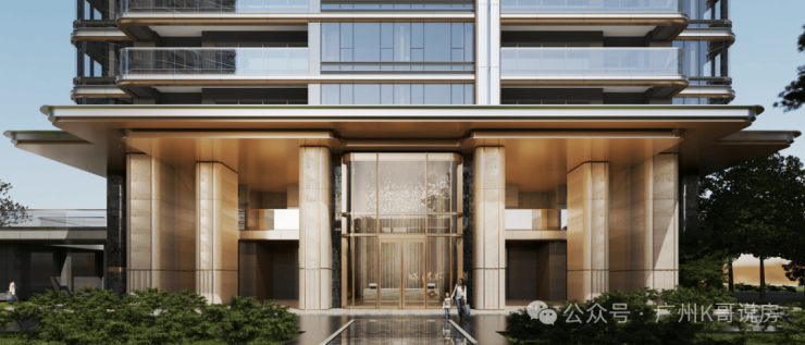 主入口是约55米宽、约8.7米挑高的酒店式大门,再以各种奢石铺陈;