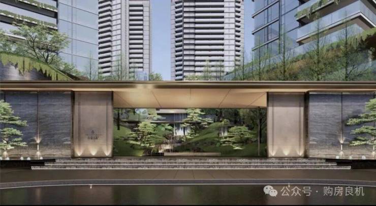 小区门庭落成15米落差瀑布,五棵悬崖式迎客黑松作揖相应,归家仪式感满满