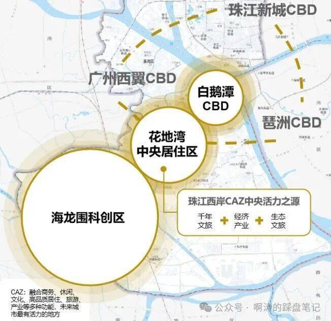 十四五规划中,荔湾“一带两区”建设是广州城芯发展之重,汇合“白鹅潭-花地湾-海龙围”打造“商、住、产”一体活力新城,构建珠江西岸CAZ黄金三极(千年文脉+经济产业+生态文旅)。