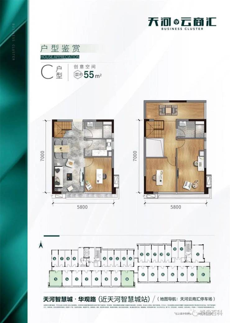 天河云商汇项目规划8栋创意空间和19栋企业总部及少量商铺,其中,32-58平商业单位,176-970平企业总部,总套数约1700套。 南北朝向,通风采光观景俱佳项目容积率仅2.0,全市罕有,筑造创意空间及企业公馆两大产品系,打造成集泛会所、创新创业、社交平台、休闲娱乐等于一体的全能型理享生活家场域,描绘令人期待的全新蓝图。 #楼盘百科