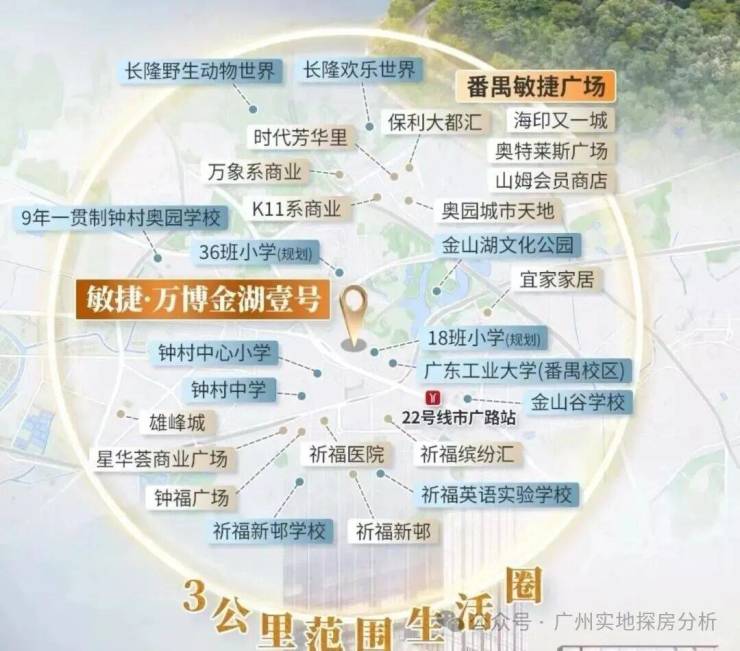 项目外立面选用弧形LOW-E玻璃与铝板材质,呈现公建化现代风格,主入口设计为长约120米的弧形界面,搭配名贵石材铺装,强化归家仪式感。社区内也规划了约2700㎡的高定会所,涵盖恒温泳池、健身空间、轻餐酒吧及私宴厅等,延伸了高端生活社交场景。项目东北侧400米就是约1630亩的金山湖,部分户型在家就能望到湖景。长隆乐园直线距离约2.5千米、大夫山森林公园直线距离约2.5千米。