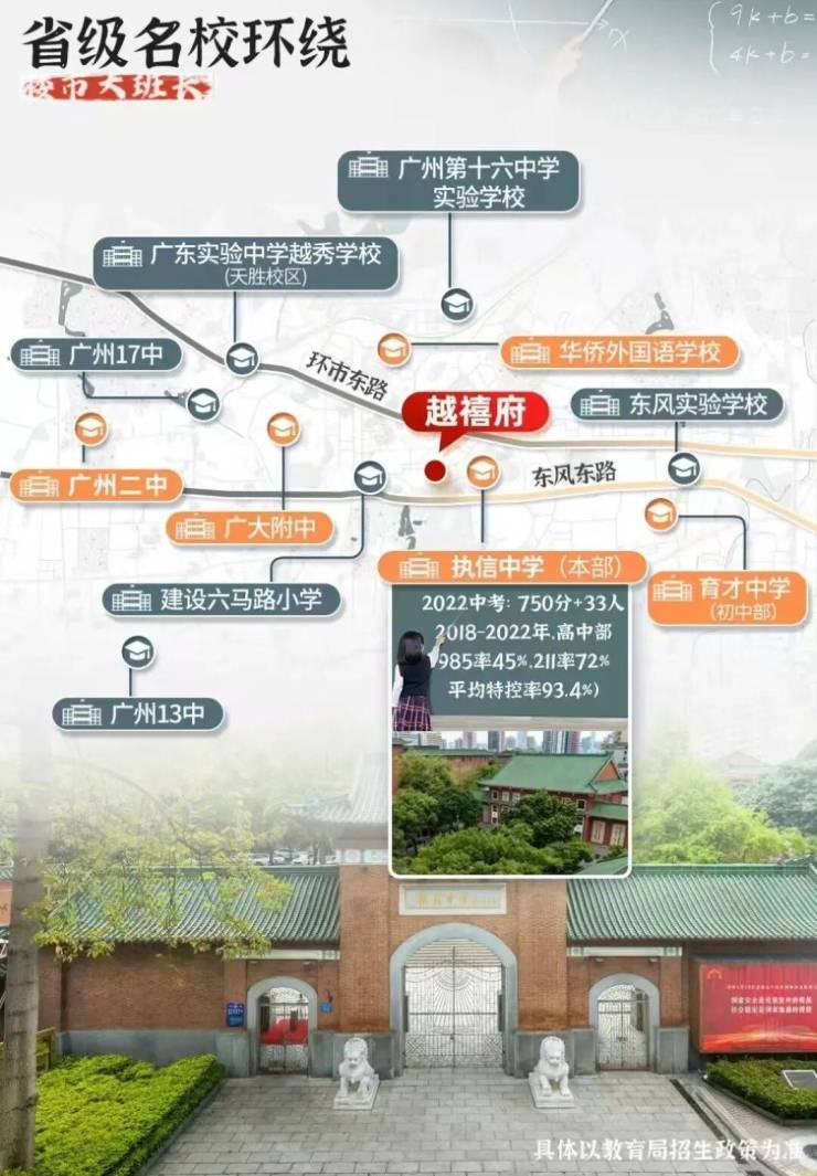 项目西侧就是执信中学,而且根据前5年越秀区学位划分情况,项目大概率会被划分至建设六马路小学的招生范围。