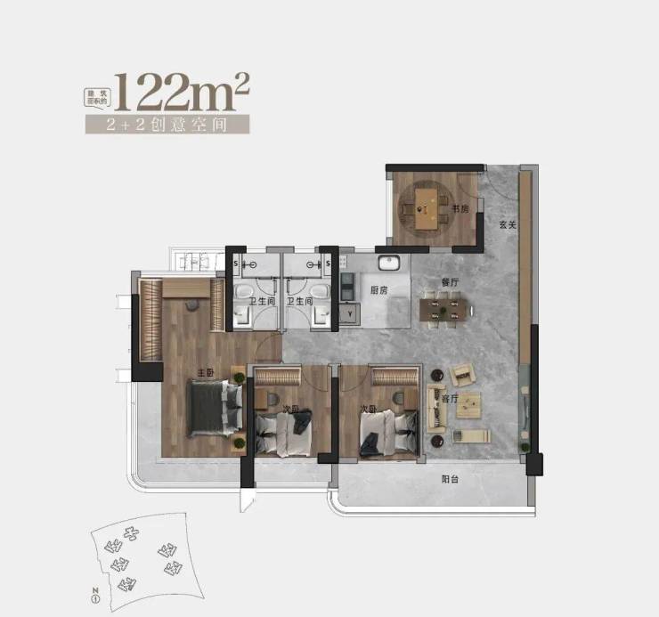 122㎡户型,约6.6M南向景观阳台 | 270°环幕瞰景主卧|多元化功能阳台