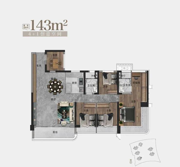 143㎡户型,南向宽景4开间设计 | 约36.5M环幕采光面 | 270°环幕瞰景主卧|多元化功能阳台