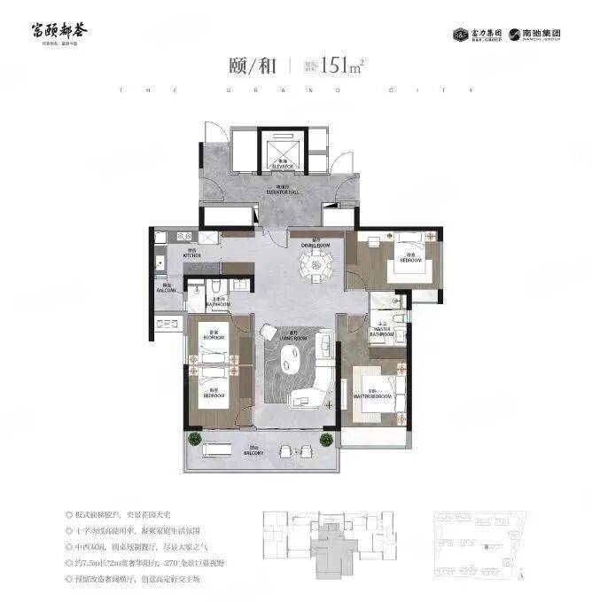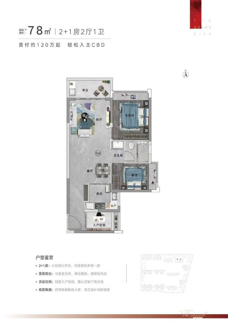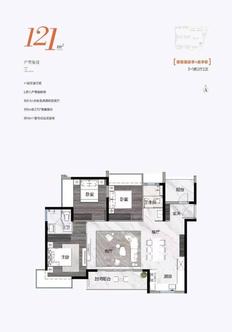 121㎡ 3+1房2厅2卫,+1房百变空间,L型入户尊崇体验,约8.1m长南北通透都荟宽厅,约5m长270°观景阳台,约46㎡豪宅式社交空间