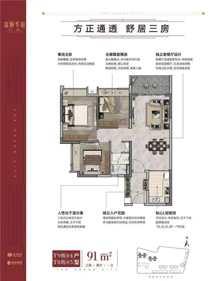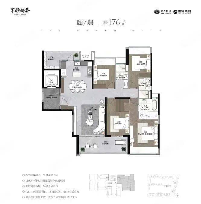 112㎡ 3+1房2厅2卫,+1房多功能空间,两梯四户南向低密度,LDKB一体化设计,全屋80cm阔景飘窗升级