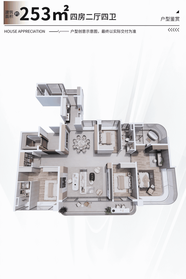 再来看建面约253㎡四房,相比196㎡而言,它完成了双倍进化!