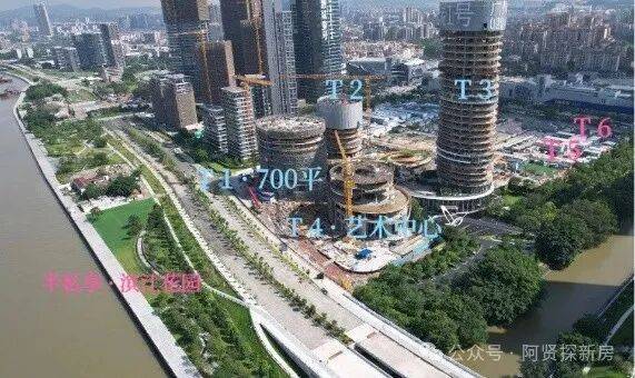 临江3栋高层为公寓,另1栋为演艺中心,靠近黄埔大道的2栋,则是公寓与顶奢酒店。其中T1为13层公寓,T2和T3为32层公寓,T4为4层演艺中心,T5和T6则分别是52层和59层商业商务大楼。