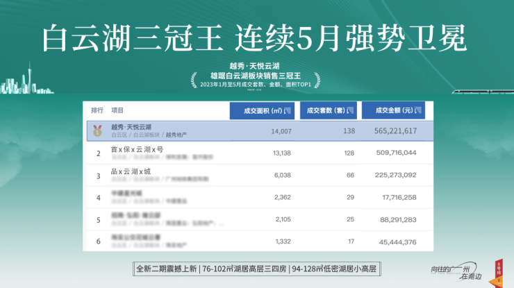越秀天悦云湖:白云湖销冠红盘,荣获2023年1-5月白云湖板块住宅成交套数、金额及面积TOP1!