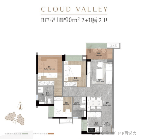 南北通透双阳台设计,瞰景阳台约6.9米,五开间朝南,主卧带独立衣帽间。