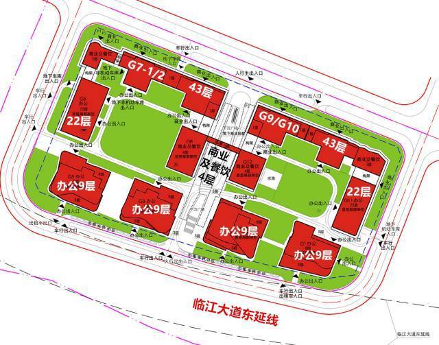 南片地块上将建起10栋办公楼+2栋商业楼,低层连廊亦将配套商业。其中,临江4栋办公楼为5-9层高,享一线江景,北部4栋办公楼最高43层,高层视野同样不受限制。