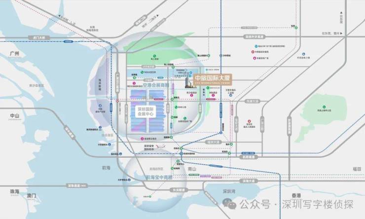 雄踞前海会展新城核心区,依托“国际航空/城际轨道/地铁轨道/城际公路/港口码头”五维交通,满足商务高效出行需求。周边会展中心、冰雪世界(2025试开业)、海上田园等资源高度聚合,构建“会展+海洋+文旅+科创”的世界级商务生态圈。
