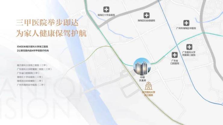 500米步行南方医科大学珠江医院,广州医科大学附属第二医院、广州市红十字会医院等多家三甲医院保驾护航。