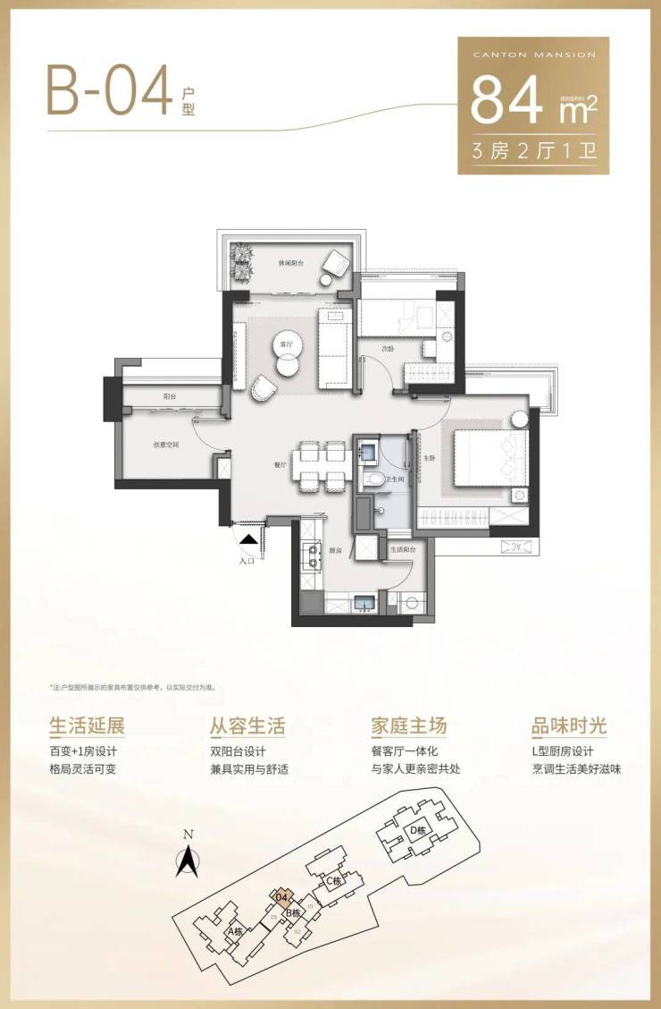 B栋产品:约84-128㎡三房至四房,三梯四户