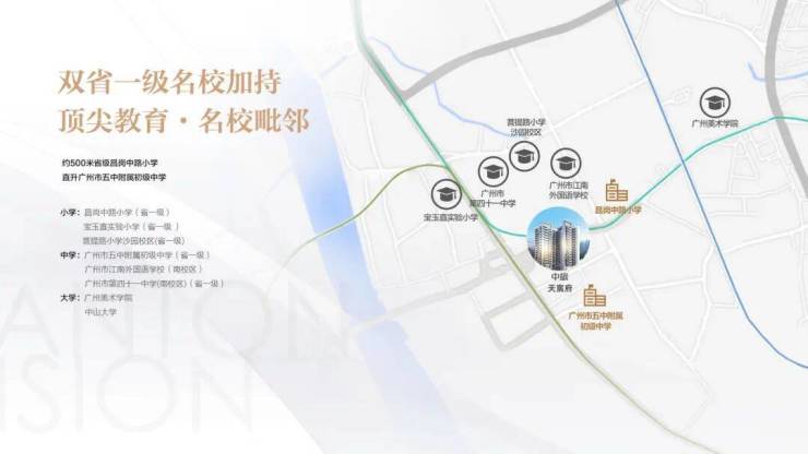 项目位于海珠区最强教育板块,根据广州市海珠区教育局政府信息公开网站,《2022年海珠区公办小学招生服务地段表》中显示,项目所属沙园街橡胶新村社区,直接对口省一级昌岗中路小学。同时,《2022年广州市海珠区初中招生问答》中显示,昌岗中路小学直升广州市五中附属初级中学。(注:学区地段规划以及小升初直升信息以教育局最新公布信息为准)