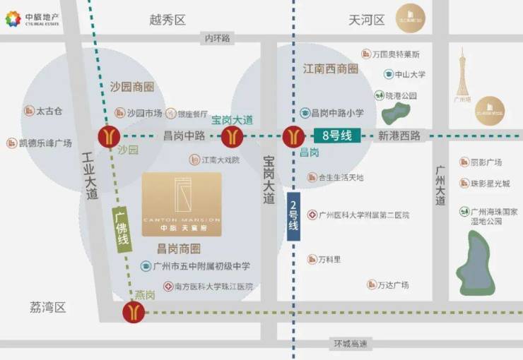 项目距离8号线宝岗大道地铁C出口仅150米,步行2分钟即达,约15分钟直达荔湾陈家祠(6站)、转2号线约15分钟直达海珠广场(4站),约20分钟到天河珠江新城(7站)。