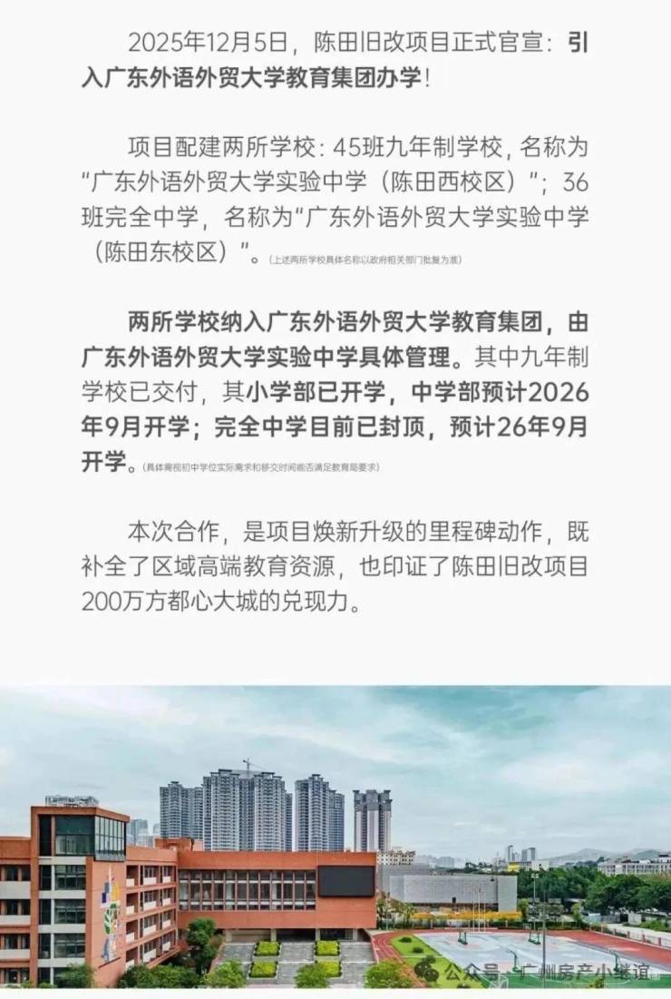 2025年12月5日,白云区陈田旧改项目华发云山境正式官宣引进广东外语外贸大学教育集团办学!
