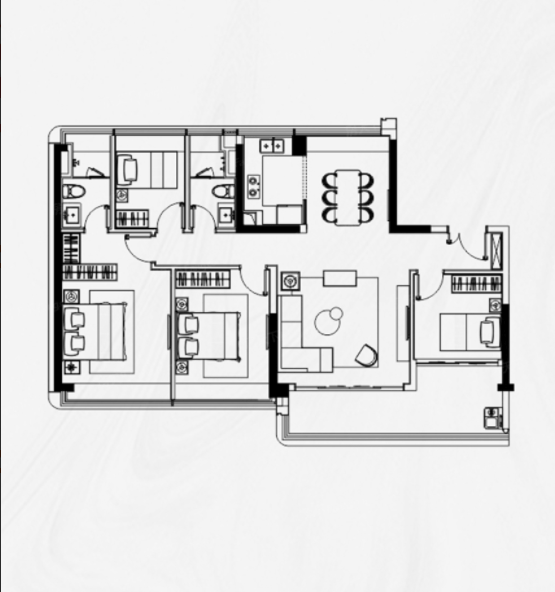 205㎡四房两厅三卫是环幕景观户型,配备近 9 米宽的巨幕双阳台,双主卧套房设计,长辈房带独立卫浴,避免日常起居干扰。