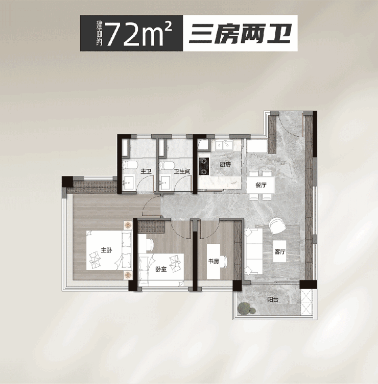 建面约72平三房,天河最小面积的双卫浴三房;