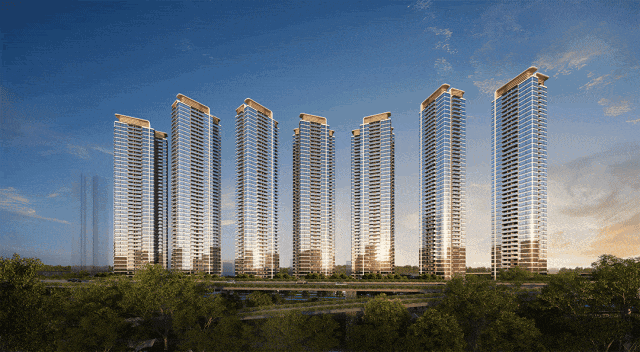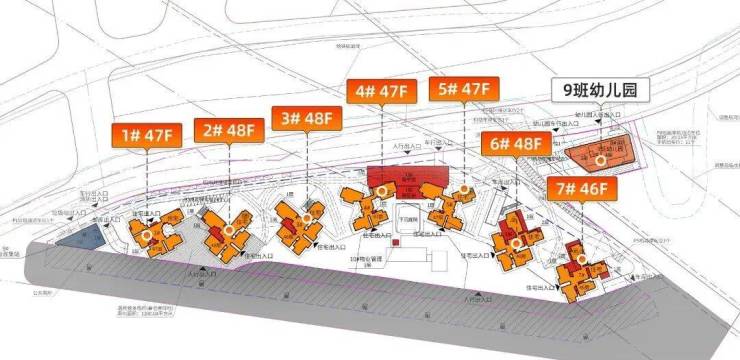项目规划7栋住宅楼,总货量2186套,其中,1-3栋为3梯5户,4-5栋为3梯4户,均为46- 48层的超高层,每栋楼都做了架空层会所。楼栋采用一字排开的布局,前后视野无遮挡,且所有户型均为100%全南向,被称为海珠版“兰亭盛荟”。