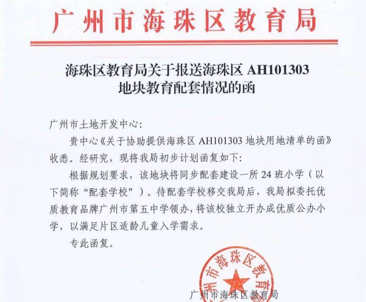 已有市委文件证实,中交·天翠业主可就近读广州市五中附属学校(规划中的24班小学),且后期可实现九年一贯制入学。