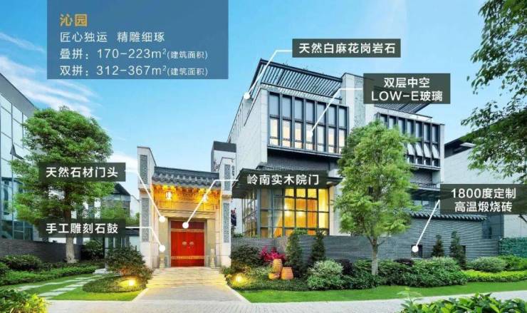 把宅院大门、花格窗、青石雕刻等传统的岭南元素与现代建筑、自然环境完美融合,打造中国特色的岭南院墅。