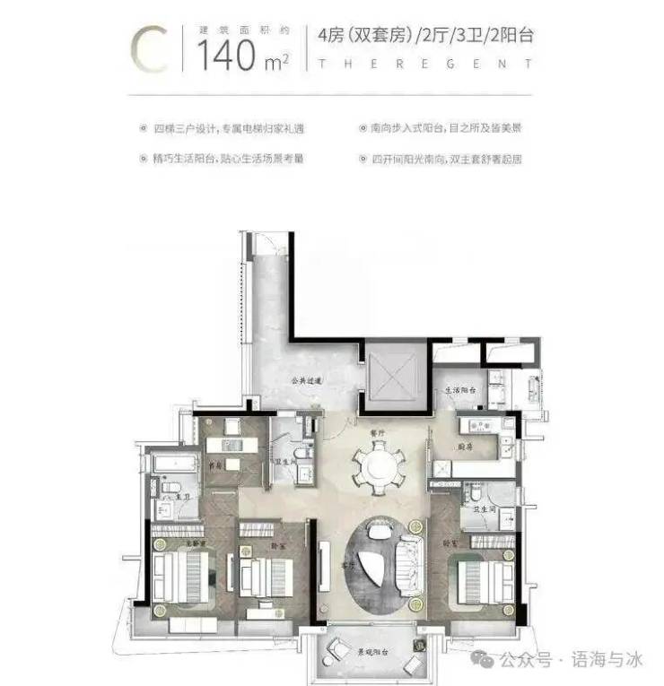 『天启』组团面积约140-250㎡环幕临江大平层,坐拥江景第一排,眺望小蛮腰,享500米宽阔无遮挡江景视野,并邀请三大全球知名设计大师倾力打造,并配备12大国际一线品牌交标,专梯专户四房双套房设计,世界灵感前沿作品礼献广州!