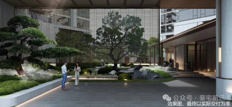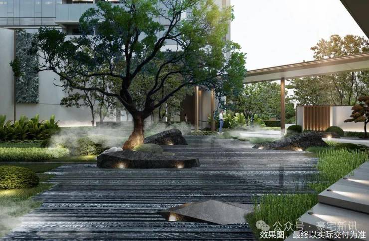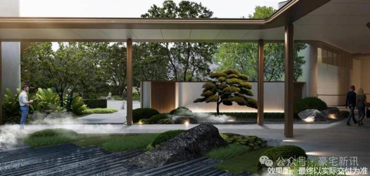 石材景墙+艺术水景+小叶紫檀组景,豪宅级归家体验。