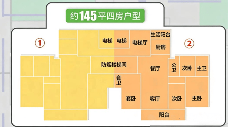 其次是145㎡四房三卫,这是项目最小面积的双套房户型,分别位于#3栋、#6栋、#7栋和#10栋,货量最大。