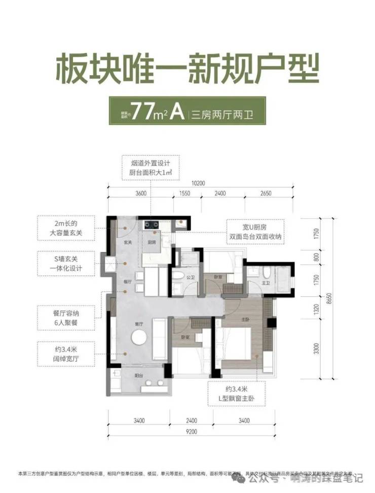 户型亮点:约 3.4 米开间客厅,约3.4米L型飘窗主卧