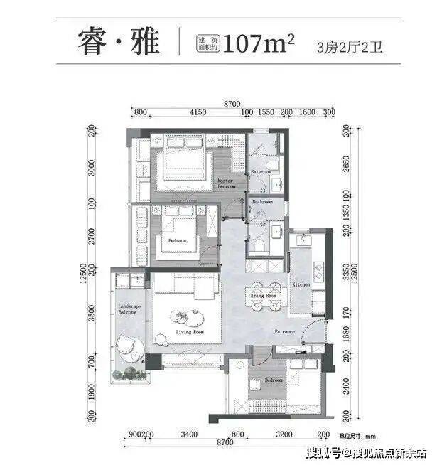 107方户型采用了LDK一体设计,半开放式厨房和4.6米大阳台,三个房间没有设计挨在一块,这样有个好处就是可以和老人分开,互不干扰。